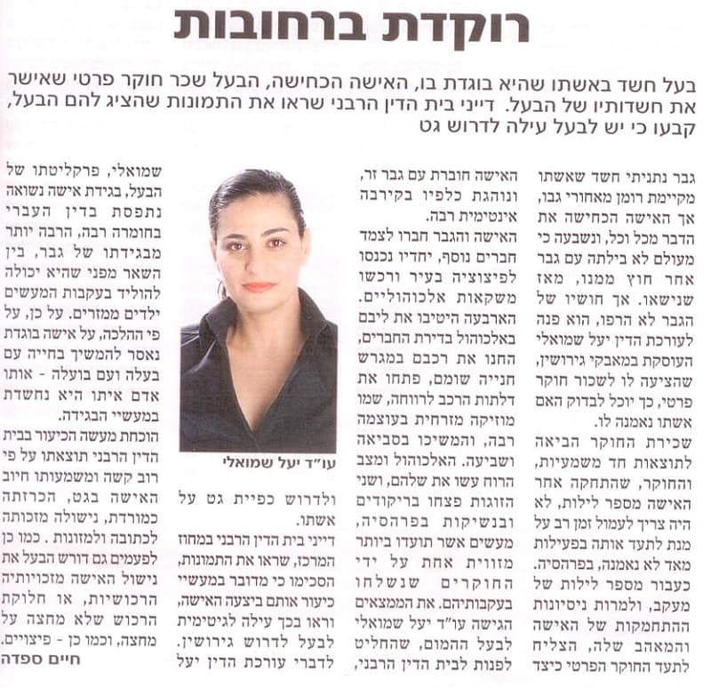 בעל חשד באשתו שהיא בוגדת בו האישה הכחישה אך הבעל שכר חוקר פרטי שאישר את חשדות הבעל. דייני בית הדין הרבני שראו את התמונות שהציג להם הבעל קבע כי יש לבעל עילה לדרוש גט בשל בגידה.